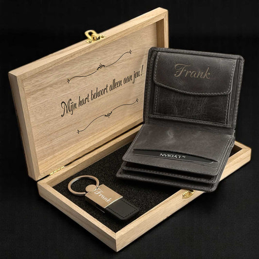 Luxus -Geschenkset: Lederbrieftasche, leichter in Holzkiste - Personalisierbar