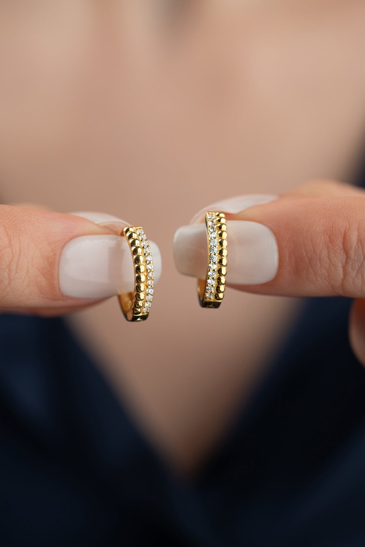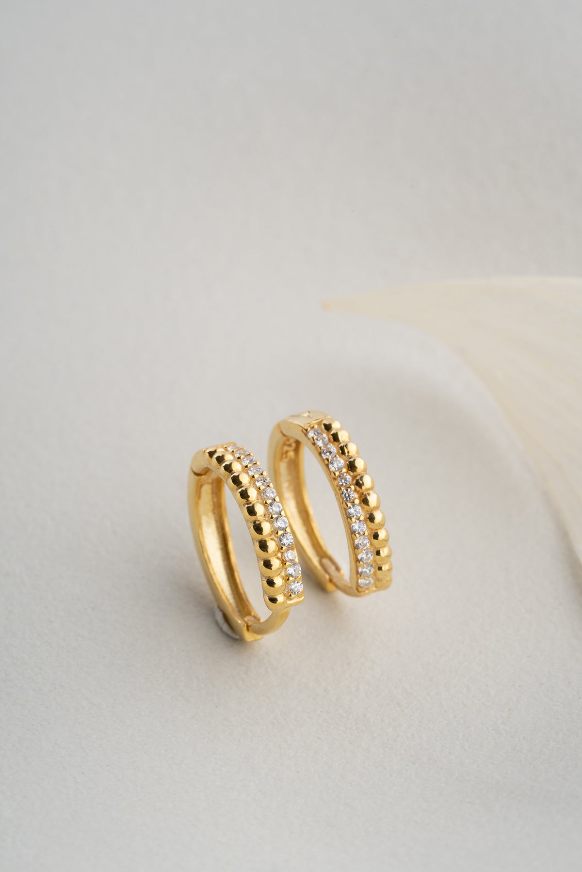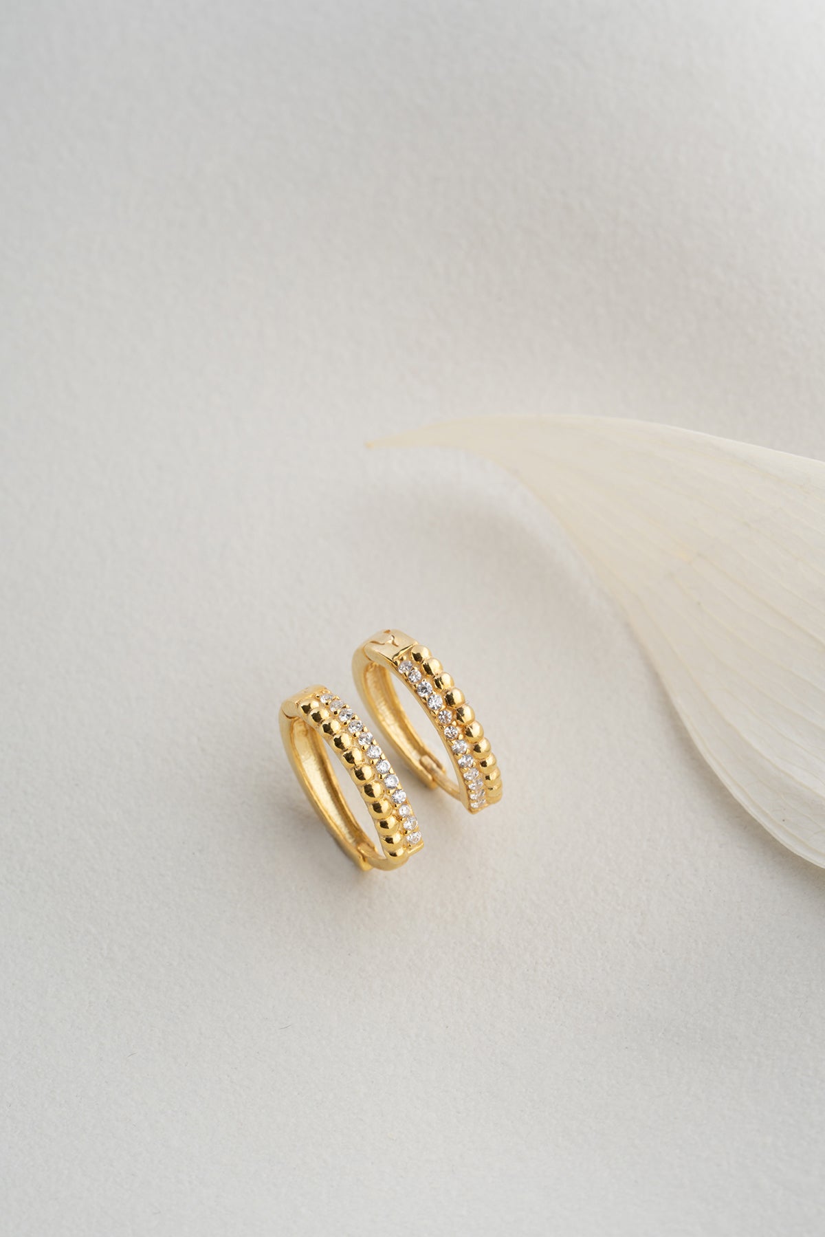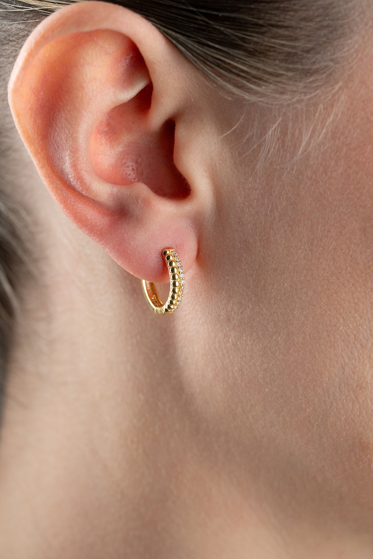 Diese stilvollen Creolen sind aus 925er Sterlingsilber gefertigt und mit einer Reihe Metallperlen und funkelnden Steinen verziert. Eine perfekte Kombination aus Schlichtheit und Eleganz, passend für jeden Anlass.