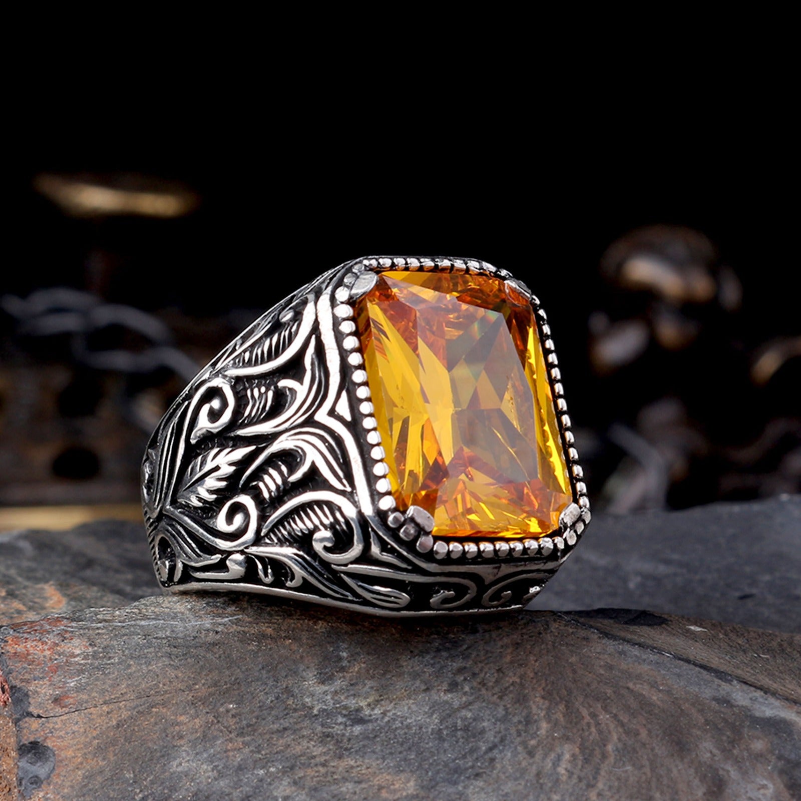 Luxuriöser Herrenring aus 925er Silber mit einem markanten gelben Zirkonia-Stein für einen stilvollen Look.