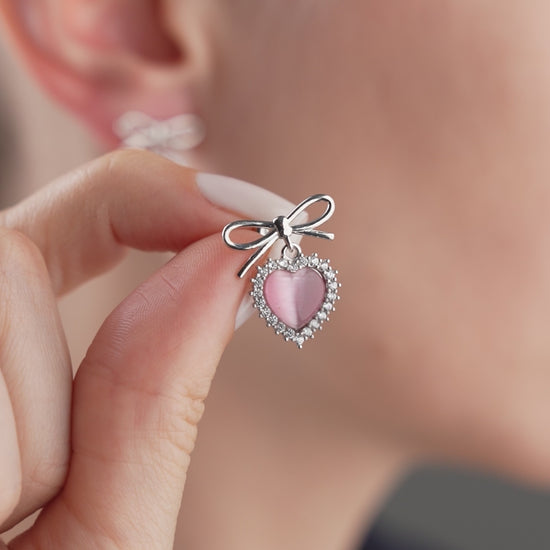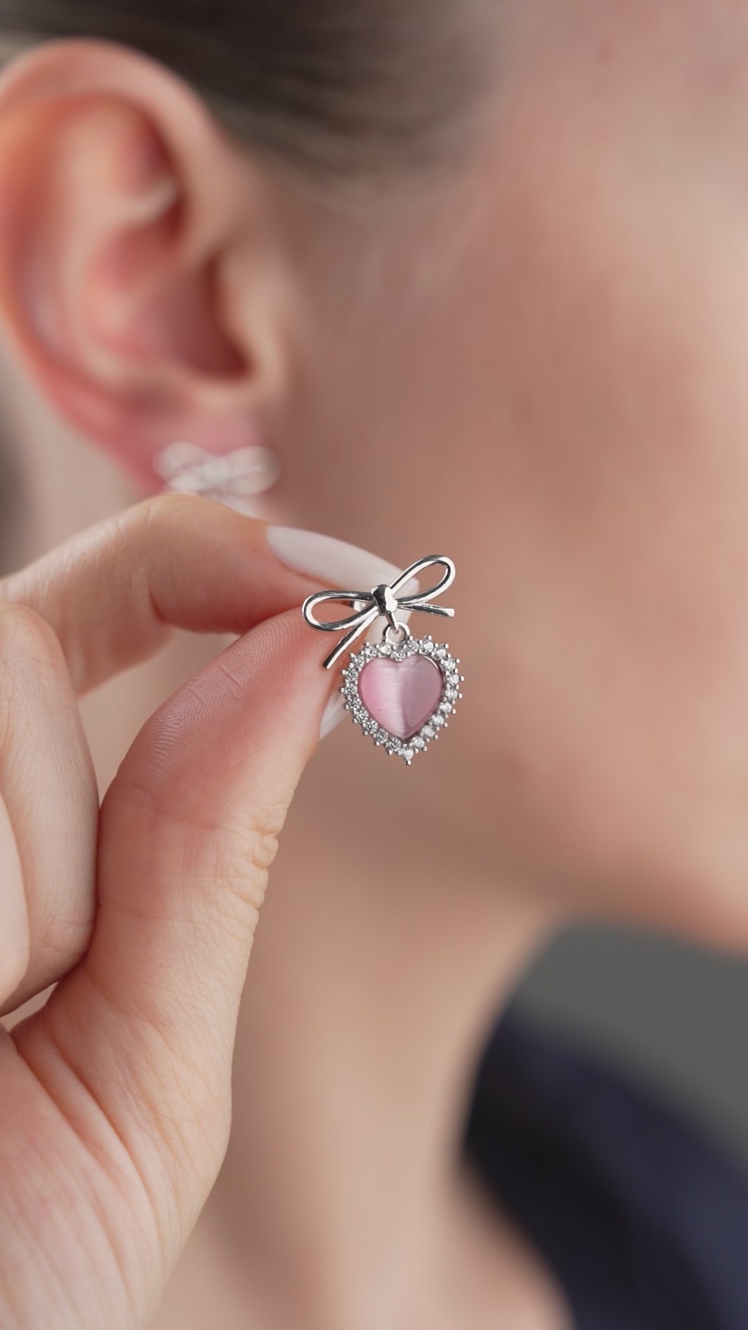 Diese romantischen Ohrringe aus 925er Sterlingsilber sind mit einem rosa Herz verziert, das von funkelnden Steinen umgeben ist. Die elegante Schleife verleiht dem Design einen verspielten und femininen Touch – perfekt für jeden Anlass.