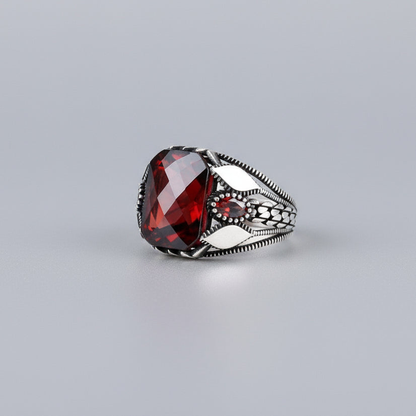 Indrukwekkende herenring van 925 sterling zilver met grote rode steen en gedetailleerde afwerking.