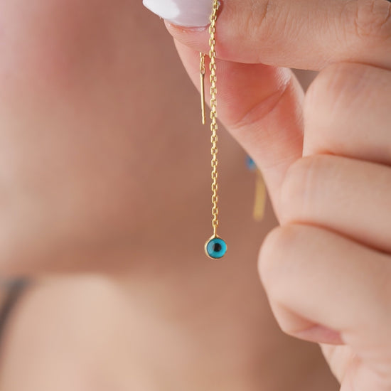 Die Ohrringe „Blue Aura“ vereinen die schützende Kraft des traditionellen „bösen Blicks“ mit moderner Eleganz. Die zarte Goldkette und die blaue Emailleperle ergeben ein subtiles und bedeutungsvolles Schmuckstück, perfekt für den Alltag.