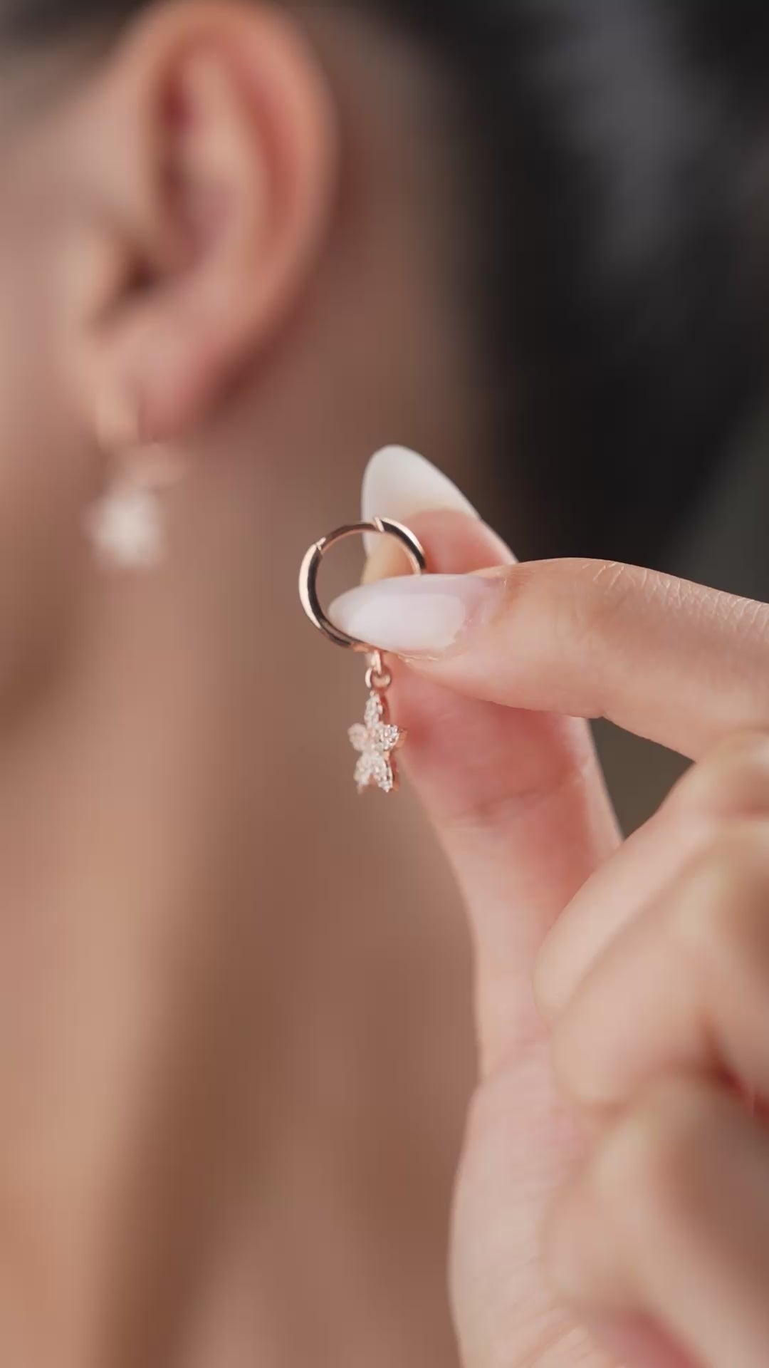 Ohrringe aus roségoldplattiertem Material mit funkelnden, mit Steinen besetzten Blüten.