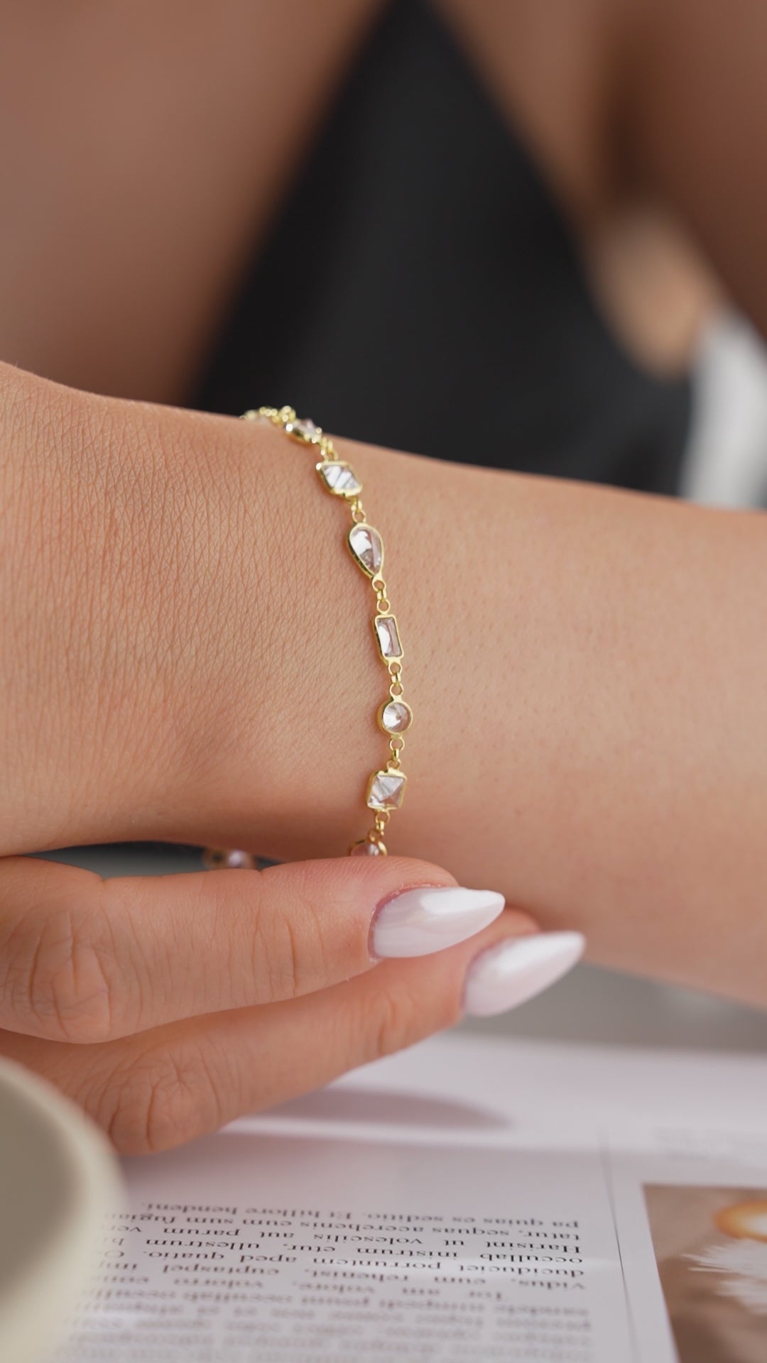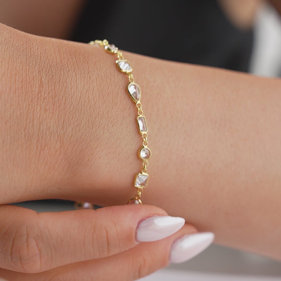 Dieses elegante Armband mit transparenten Steinen in verschiedenen Formen verleiht Ihrem Handgelenk eine raffinierte Note. Perfekt für den Alltag oder besondere Anlässe. Das vergoldete Design sorgt für einen luxuriösen Look ohne Kompromisse beim Komfort.